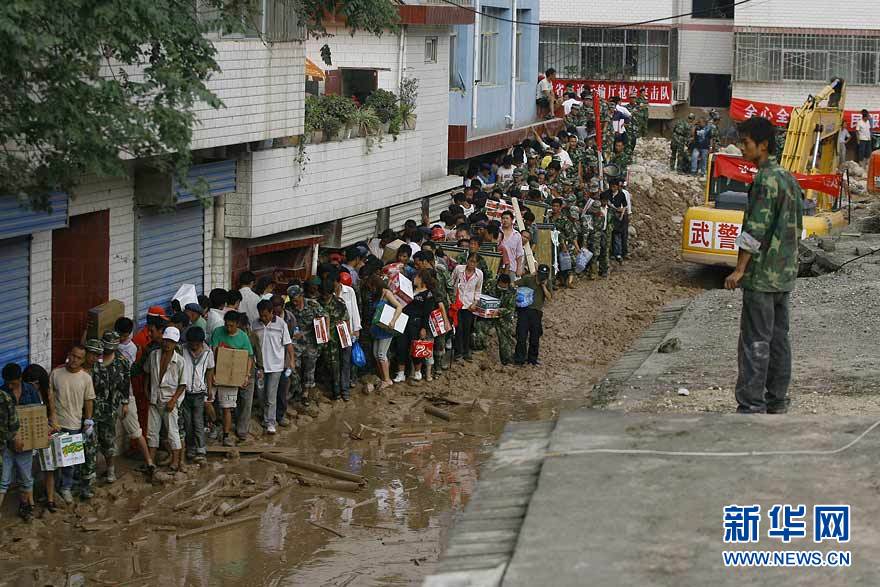 8月9日,在甘肅舟曲災區,救援人員和當地群眾拿著(zhù)救援物資,走在被泥石埋沒(méi)的街道上。甘肅省舟曲縣特大泥石流災害發(fā)生后,搶險救災行動(dòng)迅速展開(kāi)。目前,舟曲災區搶險救災仍面臨急需盡快處理堰塞湖、疏通白龍江河道,急需恢復供水系統,急需盡快恢復電力、道路、通訊等基礎設施,清淤工作困難重重,急需飲用水和方便食品,急需支援中小學(xué)教材等六項艱巨任務(wù)。新華社發(fā)