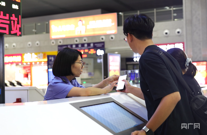 龍巖站“海峽情·閩西紅”服務(wù)臺工作人員為旅客解答(央廣網(wǎng)發(fā) 劉鑫根 攝)