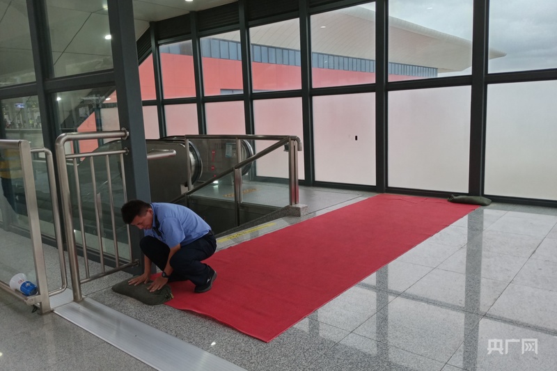 泉州南站工作人員在電梯口鋪設防滑地毯和防洪沙袋,防止旅客滑倒(央廣網(wǎng)發(fā) 童睚鵬 攝)