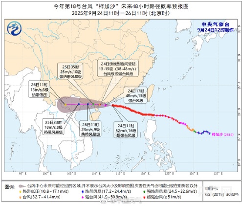 大風(fēng)預報:24日14時(shí)至25日14時(shí),廣東中西部沿海、廣西沿海和南海北部的部分海域或地區風(fēng)力有10-13級、陣風(fēng)14-15級,臺風(fēng)中心經(jīng)過(guò)的附近海域或地區風(fēng)力可達14-16級、陣風(fēng)17級以上。