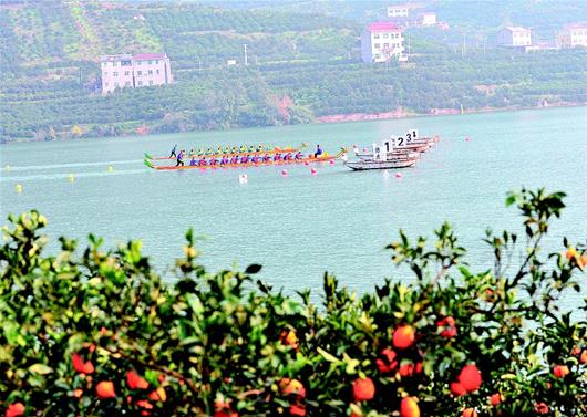 12月12日,在秭歸縣水田壩鄉吒溪河,參賽龍舟隊伍奮力爭先。當日,第十屆湖北省龍舟大賽吒溪河舉行,來(lái)自全省的12支龍舟隊伍展現龍舟激情,喜慶臍橙豐收。
