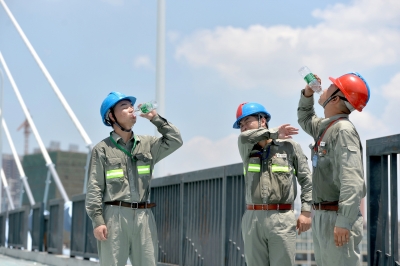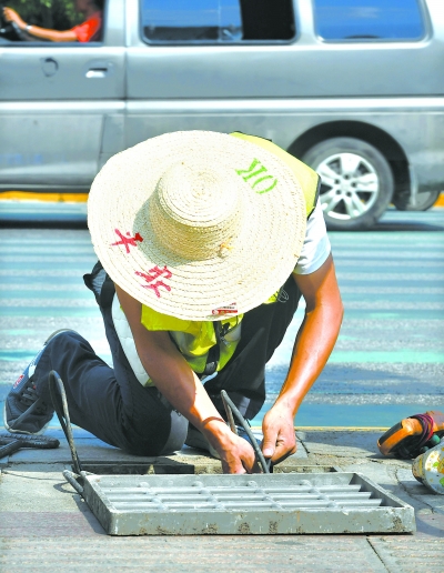 因條件限制,工人頂著(zhù)烈日在月湖橋施工,橋上沒(méi)有一處遮陰位置