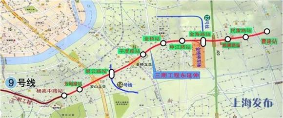 9號線(xiàn)三期東延伸(起自9號線(xiàn)二期工程終點(diǎn)楊高中路站,自西向東延伸,終點(diǎn)站曹路站),全長(cháng)13.8公里、車(chē)站9座。目前全線(xiàn)結構貫通,正在進(jìn)行軌道鋪設和車(chē)站裝修安裝施工。