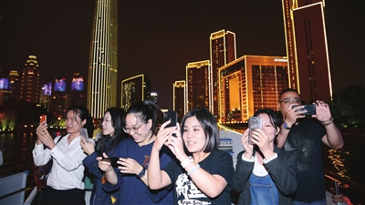 隨著(zhù)游船緩緩駛出碼頭,大家趕緊拿出手機、相機,選好角度,架起“長(cháng)槍短炮”,時(shí)刻準備著(zhù)定格最美瞬間,生怕錯過(guò)任何一處景致。的確,記者在船中也有著(zhù)同樣的感受:遠遠望去,海河夜景呈現出橘與黃搭配的暖色調,在這種充滿(mǎn)藝術(shù)感的氛圍中,海河水面閃爍的波光燈影的美、流動(dòng)不息的美,揮之不去,一種歡喜而眷戀的心情油然而生。