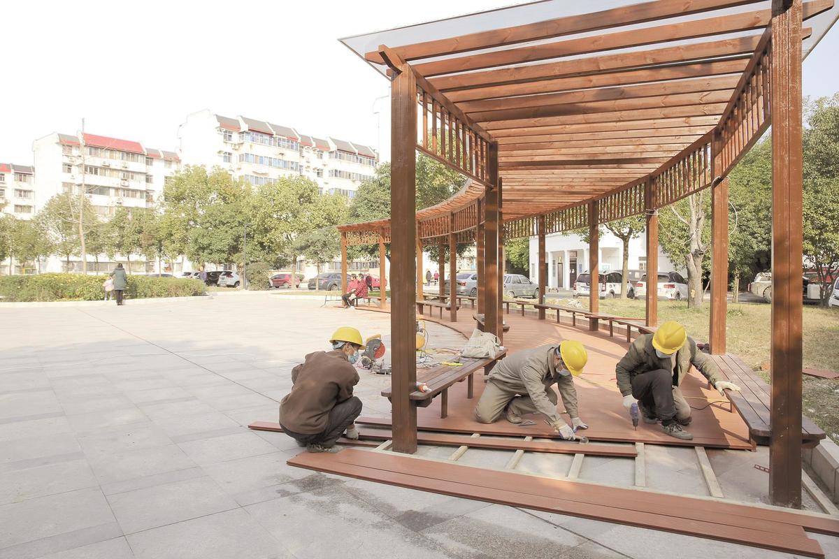 友誼新村小區“三供一業(yè)”改造即將完成。12月10日,工人在小區鋪設涼亭地板。徐春曉 攝